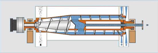 三相離心機(jī)結(jié)構(gòu)主要由差速器,螺旋,轉(zhuǎn)鼓、罩殼、機(jī)座、潤(rùn)滑系統(tǒng)、電機(jī)等部分組成。其工作原理是:懸浮液經(jīng)進(jìn)料管、螺旋出料口進(jìn)入轉(zhuǎn)鼓。在高速旋轉(zhuǎn)產(chǎn)生的離心力作用下,比重較大的固相顆粒沉積在轉(zhuǎn)鼓內(nèi)壁上,與轉(zhuǎn)鼓作相對(duì)運(yùn)動(dòng)的螺旋葉片不斷地將沉積在轉(zhuǎn)鼓內(nèi)壁上的固相顆粒刮下并推出排渣口,不同比重的液相會(huì)在轉(zhuǎn)鼓內(nèi)形成兩道液環(huán),經(jīng)大端蓋的兩個(gè)不同的出口流出。